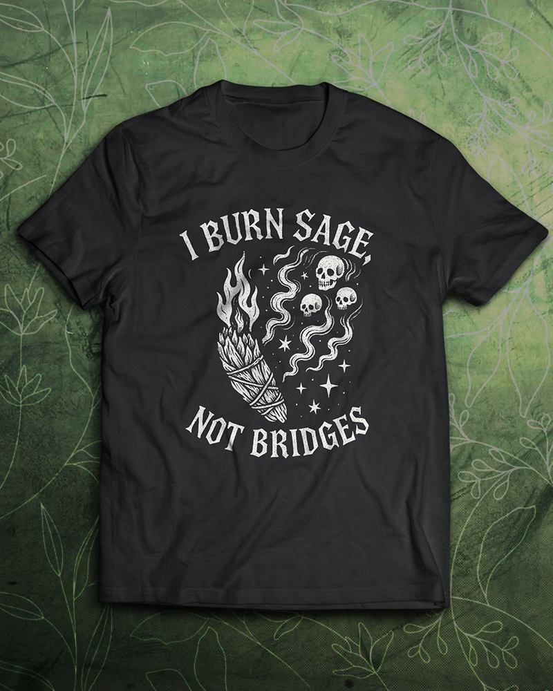 Cleanse your aura, not your social life. This is the I Burn Sage, Not Bridges T-shirt.